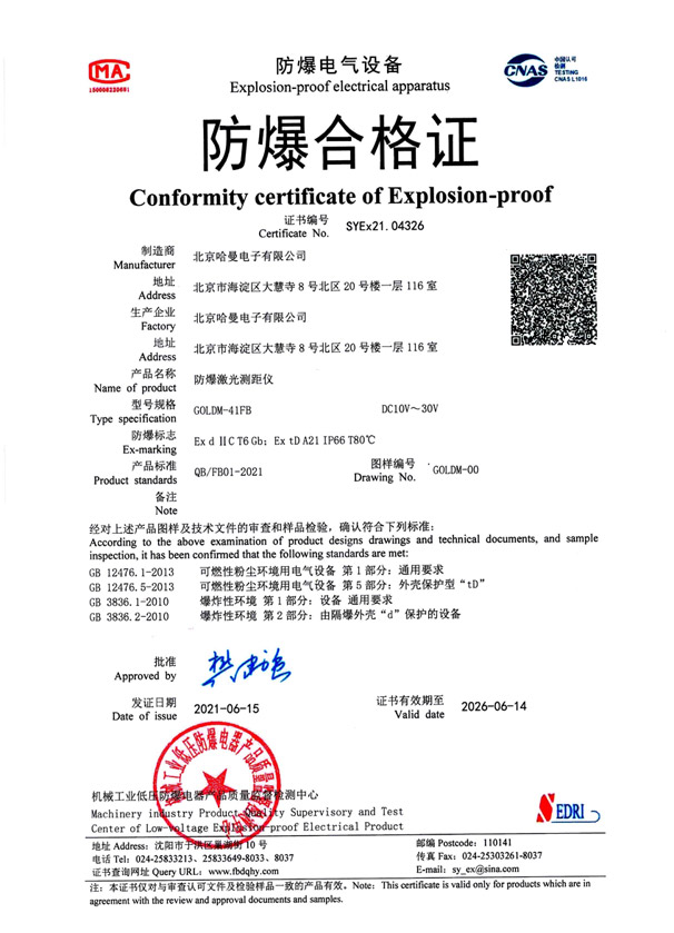 GOLDM-41FB 型防爆设备离子束测距仪关键合适于着火实验室气体实际情况中 1 区或 2 区 IIC 类 T6 组及这 的着火概率场景,使用于钢铁集团厂、然气厂、煤焦厂、打火机油矿业等易爆场景物位、料位及液位的测量。